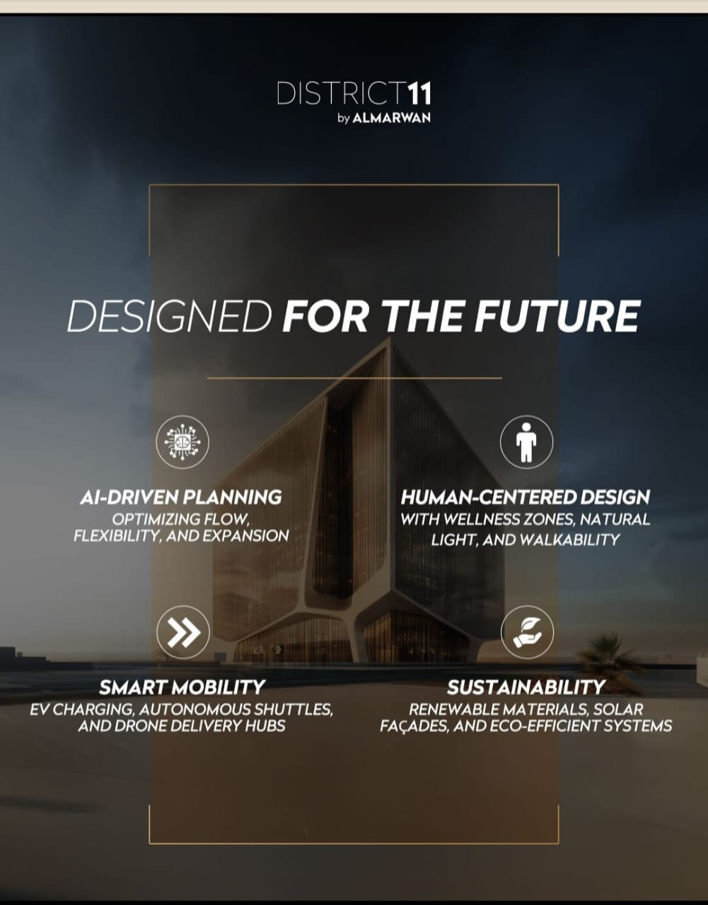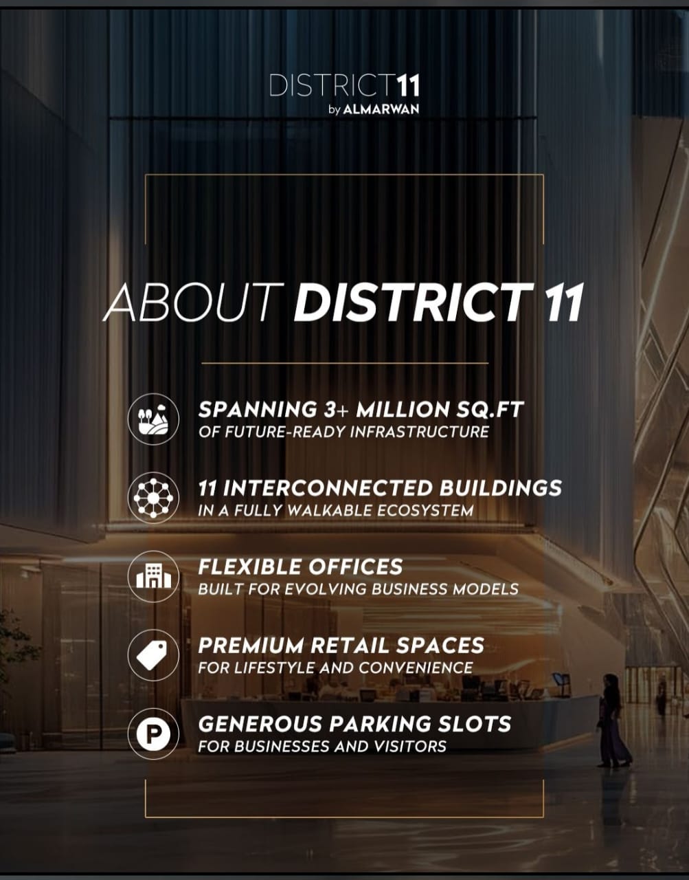 * يقع مشروع District 11، الذي طورته مجموعة المروان العقارية في الشارقة، مباشرة على طريق الشيخ محمد بن زايد في منطقة المويلة، ويُعتبر أحد أهم المشاريع التجارية الجديدة في الإمارة. تبلغ مساحته الإجمالية حوالي ثلاثة ملايين قدم مربع، ويتألف من أحد عشر مبنى تجاري ومكتبي تضم مكاتب ومتاجر تجزئة ومطاعم ومقاهي والعديد من المرافق التجارية.