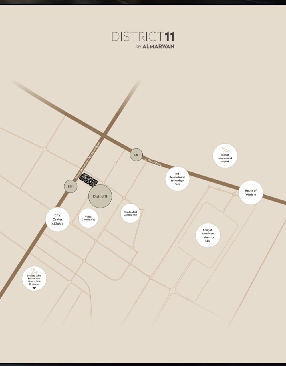 *يقع المشروع على مقربة شديدة من مطار الشارقة الدولي ومدينة الشارقة الجامعية ومركز مدينة الزاهية، ويبعد حوالي 25 دقيقة فقط عن وسط مدينة دبي، مما يمنحه ميزة كبيرة للمستثمرين والشركات التي تبحث عن موقع استراتيجي